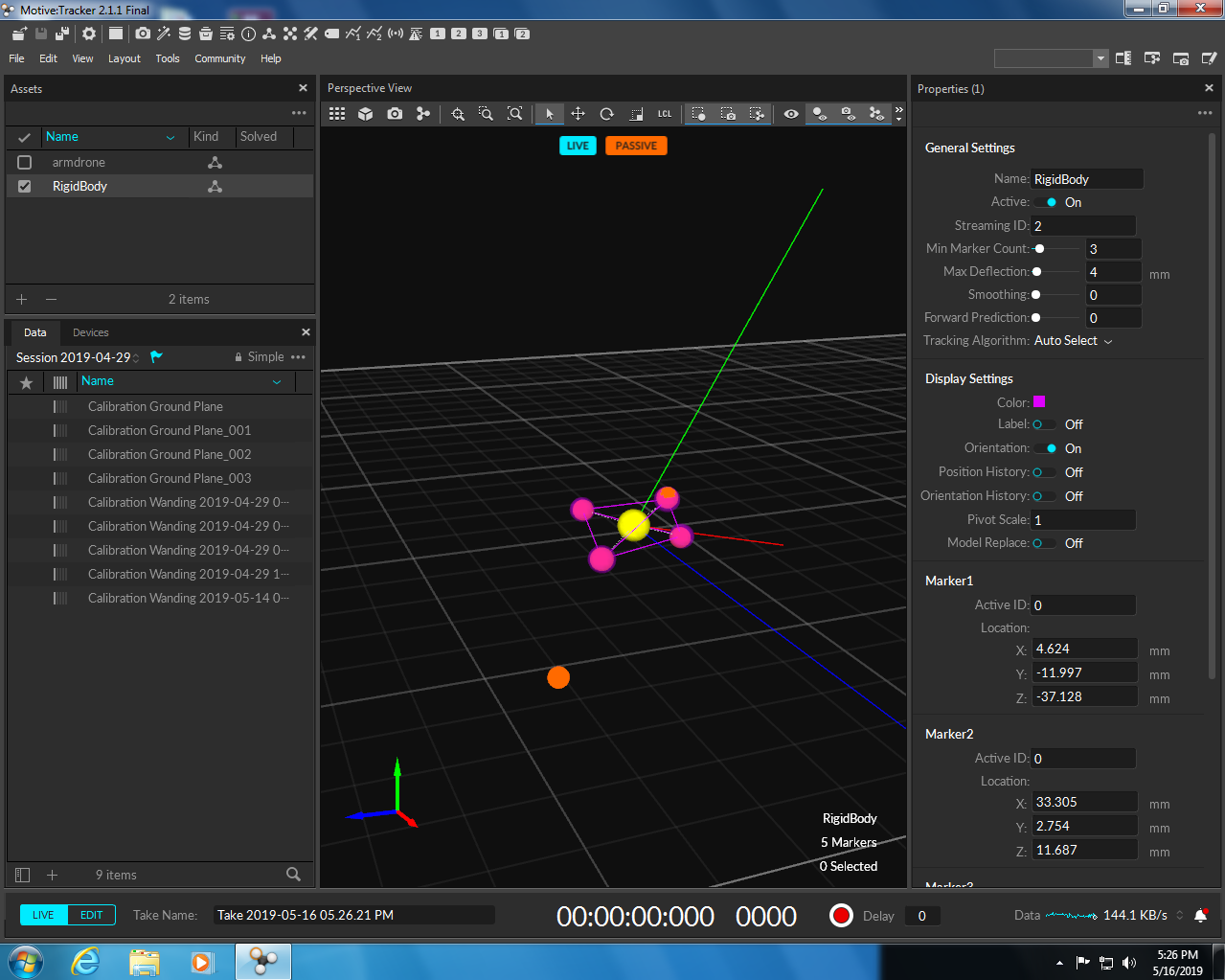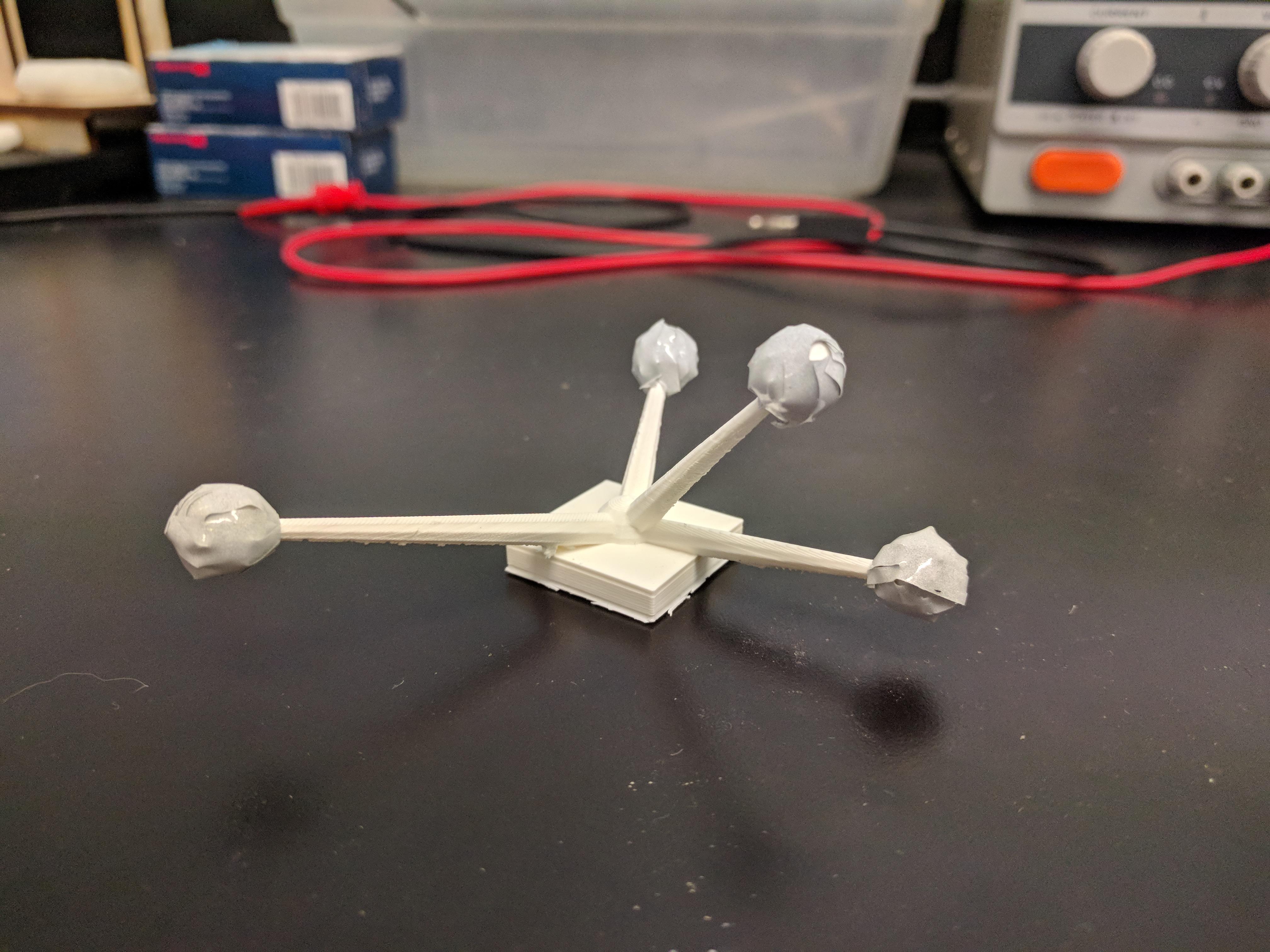 Since we were already 3D printing our markers, it would also be possible to print out a single part with multiple tracking points. In fact, there already is a solution: a parametric 3D model that randomizes a cluster of markers by Bruce Thomas. (The file does not check for intersections or spacing when randoming the marker positions. I may want to add these features in the future, but in the meantime, simply randomizing the values until a satisfactory model is generated is good enough). Having a single structure for all the markers ensures that the relative positions of the markers is fixed for optimal tracking. Additionally, these clusters are especially useful for our purposes since we need to have unique marker configurations to differentiate between each robot. The clusters allow for greater variation since positions are no longer constrained by the structure of the robot.