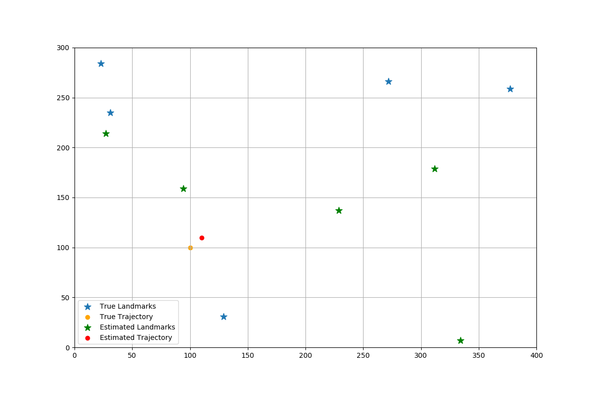Attached is a simple demo on one-step update of EM-SLAM algorithm. Note that the robot has only one observation at the begining, and then with an EM algorithm, the landmarks will converge to a certain configuration, but not exact position due to the prior guess of robot state has error. With a correct configuration generated, I can continue to work on recursive version of EM-SLAM.