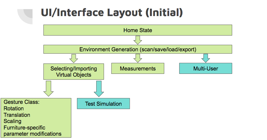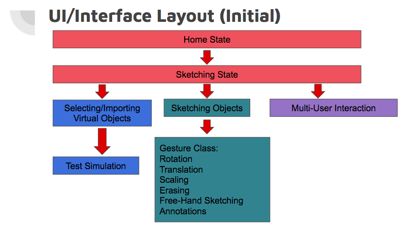Here, home state is treated as the starting point of the application, which immediately translates into a sketch state- utilizing the camera that displays the virtual environment, users are introduced into an open world where they have access to sketching mechanisms that are based on existing libraries such as Tiltbrush. Using this sketching state, users can not only select existing objects, but also sketch new ones and adjust its parameters. They can also interchange with collaborative channels and multiuser services that can be access through Unity's Photon server.