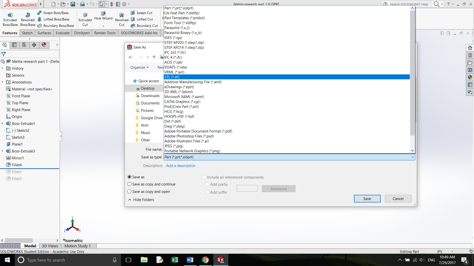 With the 3D CAD model we have, we will save the CAD model file as a .STL. STL: Standard Tessellation Language