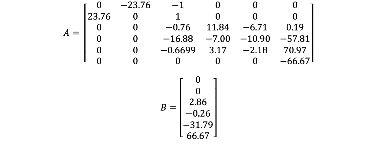 The control frame is changed such that in the control frame, the propeller lies on the xz plane. The resulting linearization matrices are: