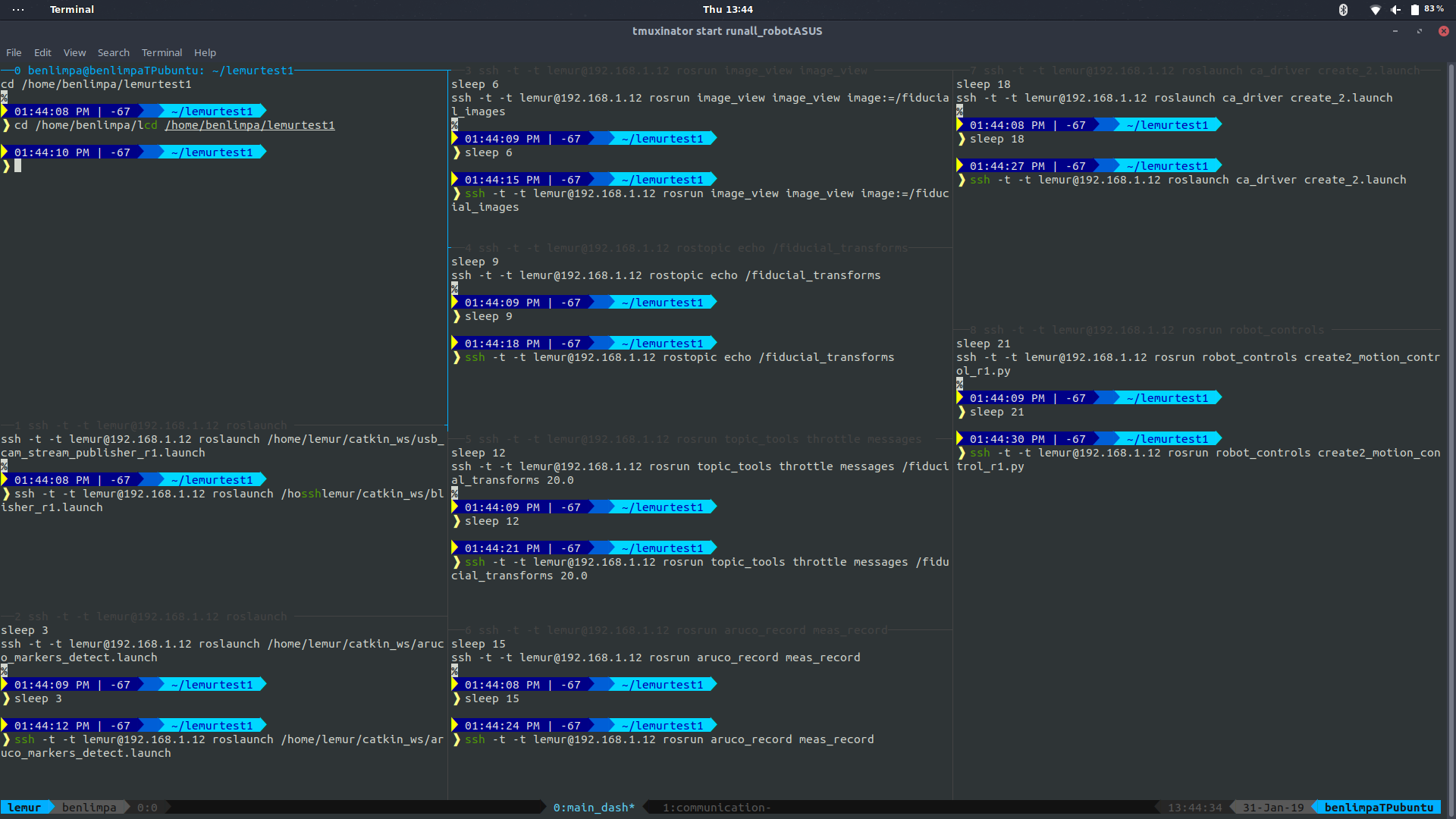 To emulate the functionality of the robot_full_run.sh script which opens up several xterm windows each running a different ROS module/script, I used tmux (terminal multiplexer) to display multiple “terminal windows” each of which run a different command in the format of ssh remote_user@robot_ip <command> <args>.