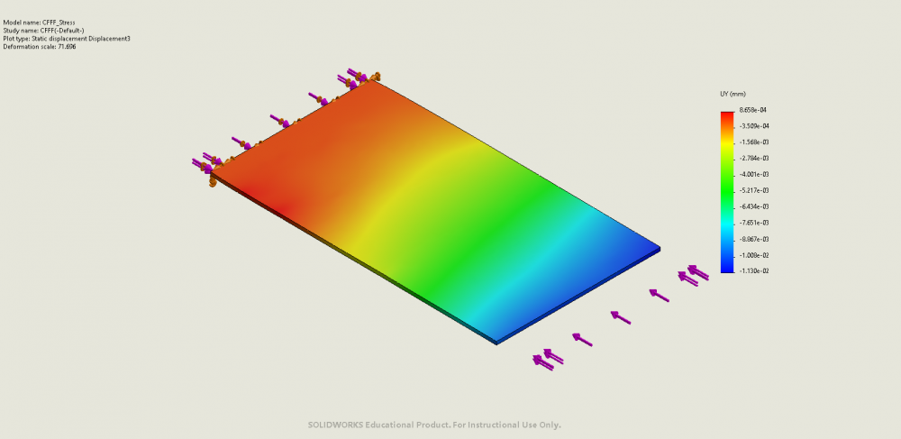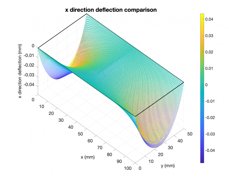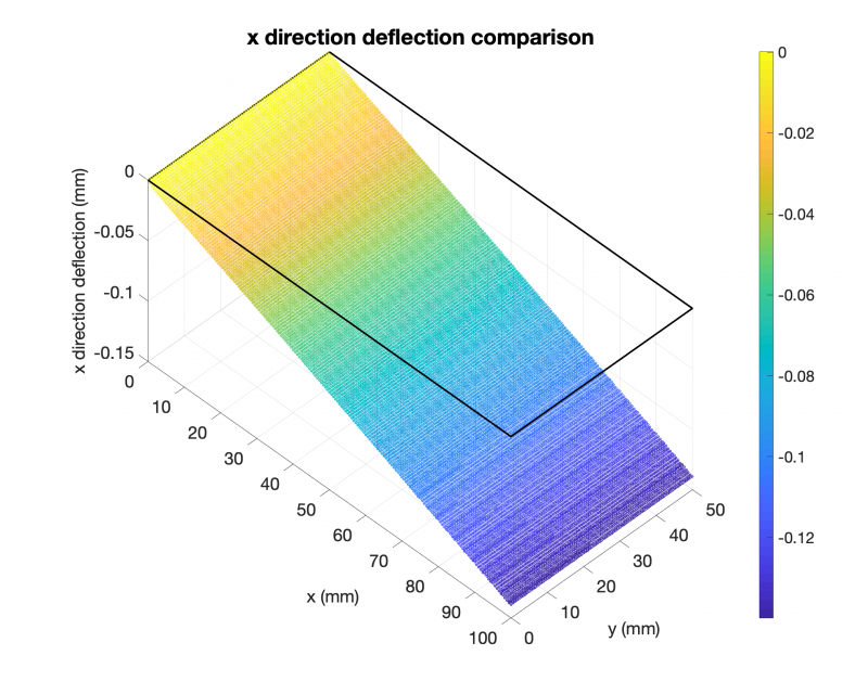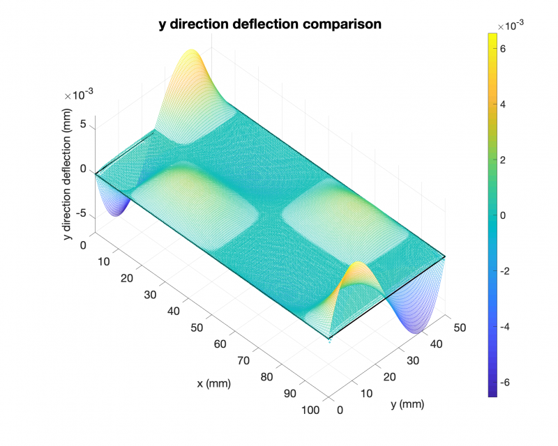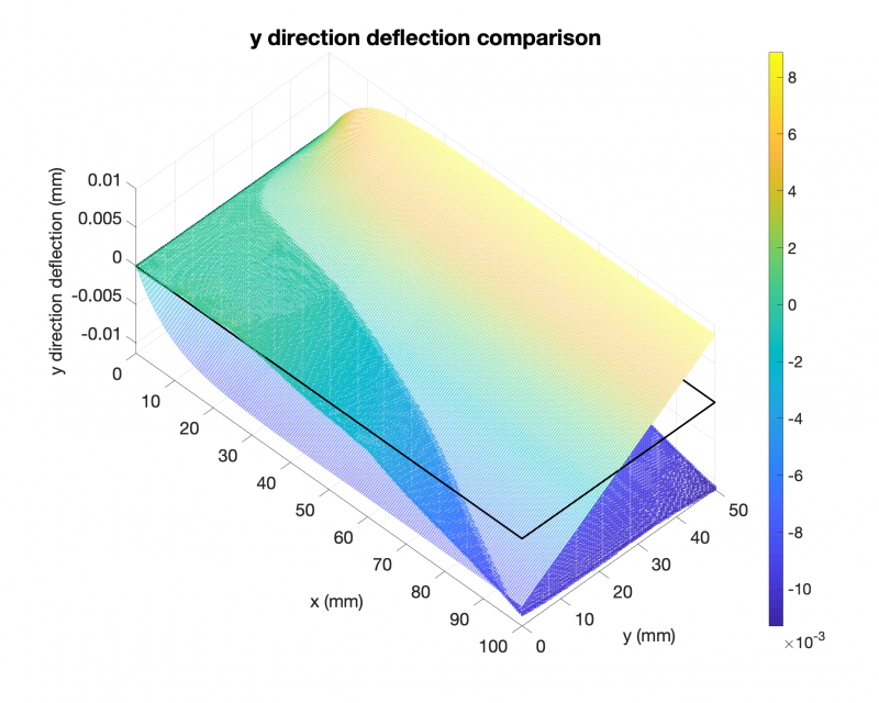 - y direction deflection is off a lot, but the magnitude is relative small compared with x direction, which have minimum effect in final result (stress). Also this could be caused by the direction of loads, which is along x axis.