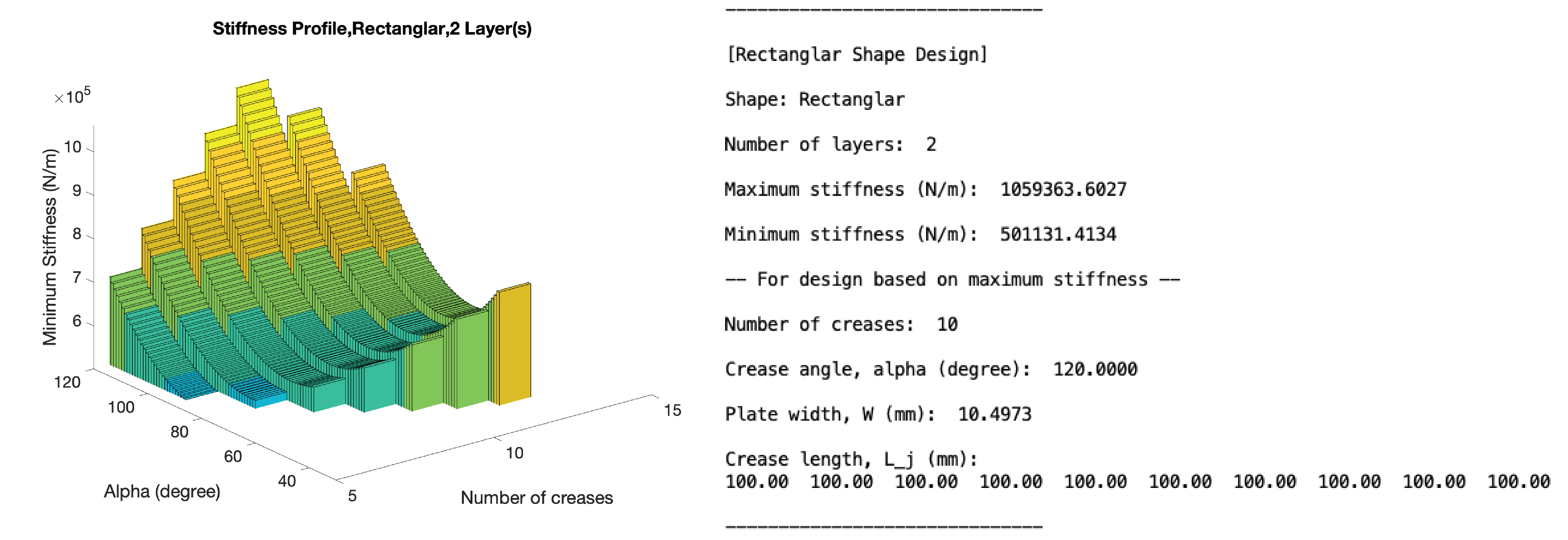 Using these constraints, the analytical stiffness model K is a function of number of creases and corrugated angle. By programing and evaluating the maximum stiffness, I got the following results: