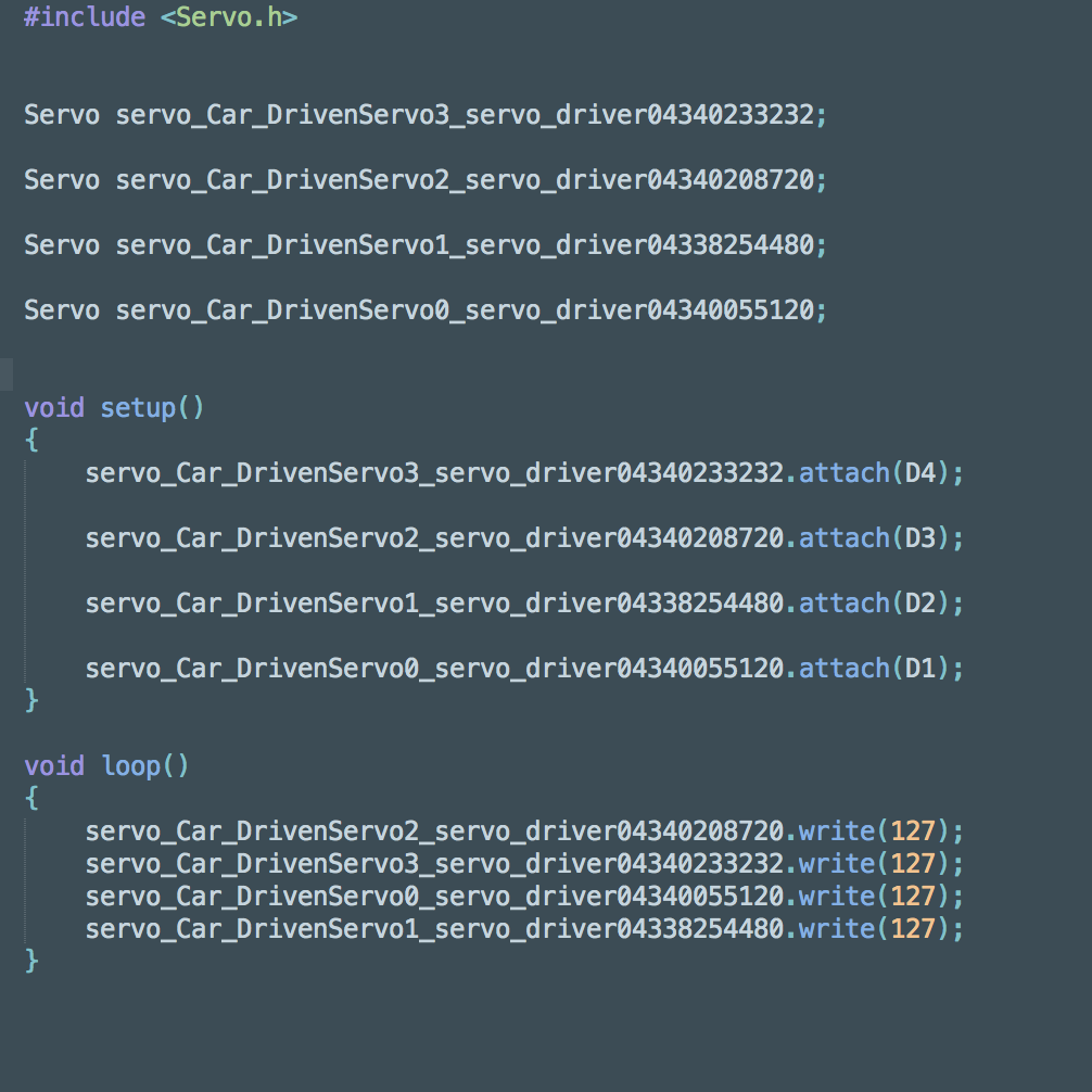 RoCo's graphical interface can now be used to drive the four wheeled car created by Jack. In order to do this, the user must drag a NodeMCU, 4 Driven Servos, and 4 Constant Blocks into the workspace, and click export to generate a builder file. Then, you plug in the PWM pins into the Driven Servos and set the parameters of the constants which dictate the speed at which the servos turn, and the car is good to go!