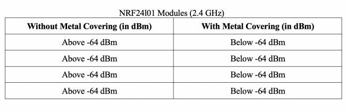 A point to point connection was created using NRF24l01 modules. NRF24l01 module do not give a numeric RSSI value. It only displays whether the signal strength is above or below -64 dBm.