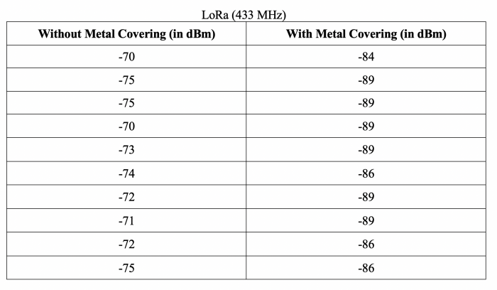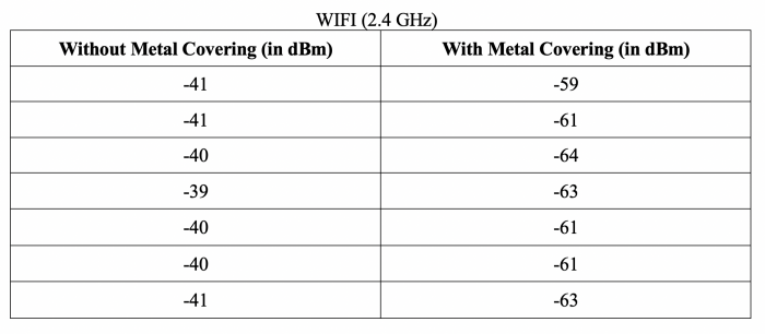 I determined the change in the signal strength of the network due to metal interference. I used the same setup as the previous experiment. Received Signal Strength Indicator (RSSI) was used as a metric to measure signal strength.