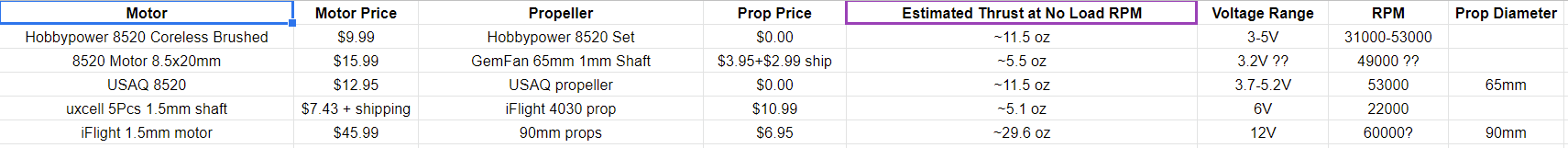 For the motors, I have compiled the below list with thrust, and will be expanding it as necessary. Eventually, I hope to be able to write an equation for propeller thrust that we can use for our design pipeline.