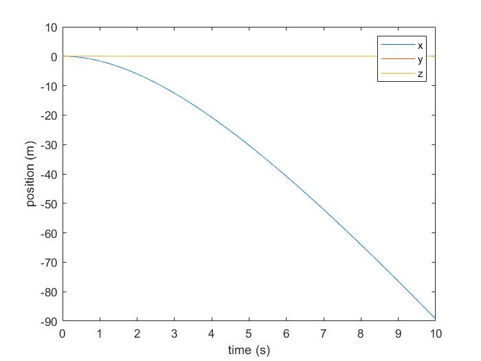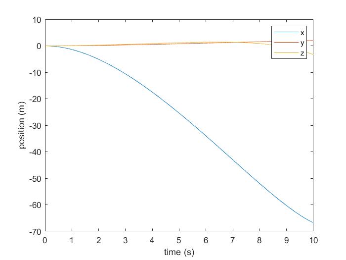 For the past two weeks I have been examining the dynamics model in MATLAB. I separated the linear and angular state variables. When setting the angular velocity of the body to zero and the initial pitch angle to 0.3454 rad, the flyer is able to maintain its position in both y and z directions, while accelerating to the negative x direction. When setting the angular velocity of the flyer body to the hover solution, the flyer is still able to retain its position, but small deviations can be seen, since the hover solution is not exact. Overall, the linear position calculation has been verified.