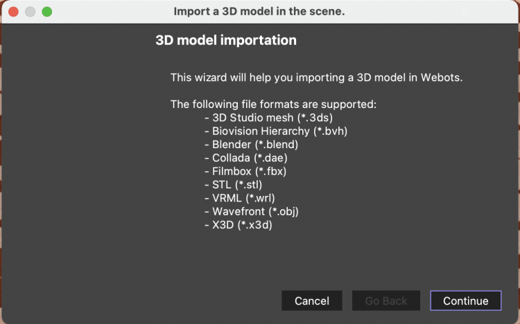 Here are the file format that Webots can import. I assume if we can export RoCo design into one of these format (also makes discrete component move independently), we can import directly into Webots.