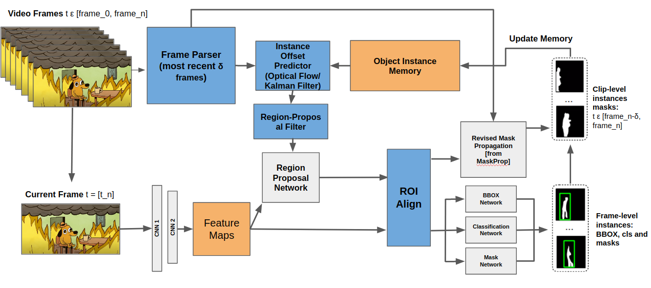 This repo serves as a jumping-off point for system integration of semantic instance segmentation and multi-object tracking in real-time applications. The initial goal of this work was the explore possible optimizations in semantic segmentation through tried-and-true methods of multi-object tracking (DeepSort). However, I found empirallcy that the region proposal network built into MaskTrackRCNN (using non-max supression) performs exceedingly well in proposing regions of interest (ROIs) to the rest of the network without clues from object tracking. Regardless, this system still has value in it's added object tracking functionality (kalman filter) and can hopefully be built into a physical platform eventually with a complete system pipeline at a later time.