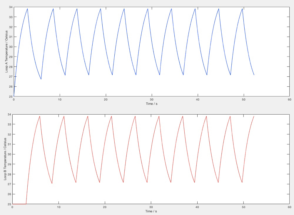 Last quarter I finished building the model of the oscillation period of the mechanical logic in one single snap-through motion. This week I studied the periodic motion of the system and found that as the oscillation becomes stable, the oscillation period tends to decrease over time before converging to a limit, which is the real oscillation period in the long run. This is due to the fact that the temperature of the actuators cannot decrease to room temperature once it has heated up. Attached is a plot of the temperature of the two actuators in the long run. The picture should be self-explanatory--the temperature of the actuators stays at a temperature slightly higher than the room temperature in the long run.