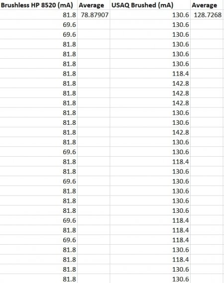 I have been working on testing power consumption. Below are the results for the brushless and brushed dc motors we currently have.