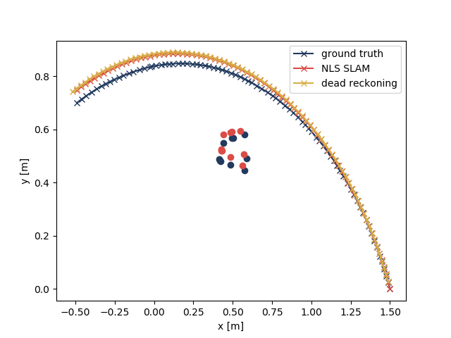 I wrote a 2D SLAM simulation on Python as a starting point. I implemented the nonlinear least squares (NLS) SLAM. To be specific, it is just to solve: