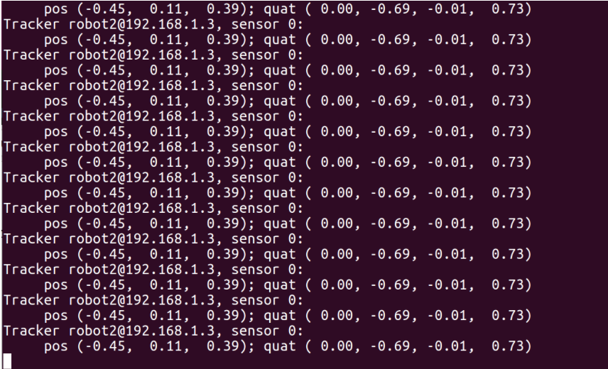 After VRPN-Client package is installed simply run below command and you should be able to see the position data of your object in Euler(m) and Quaternion: vrpn_print_devices tracker_name@vrpn_server_IP_address