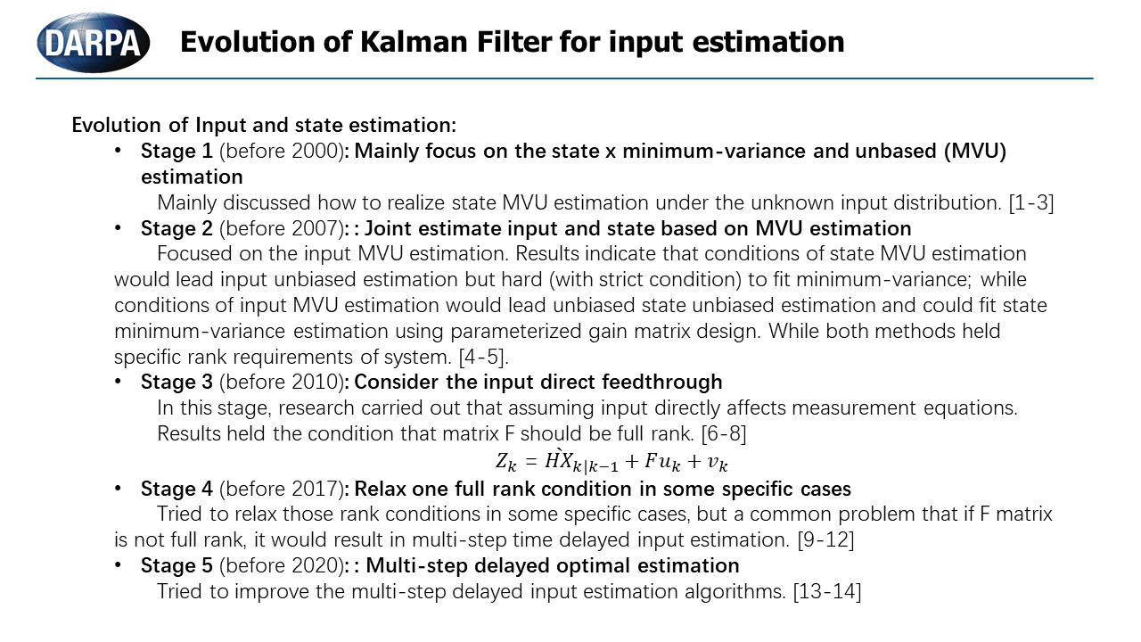 Those slides are presenting the evolution of input estimation based on Kalman Filter. I picked up 14 papers as the representatives of those evolution.