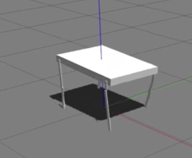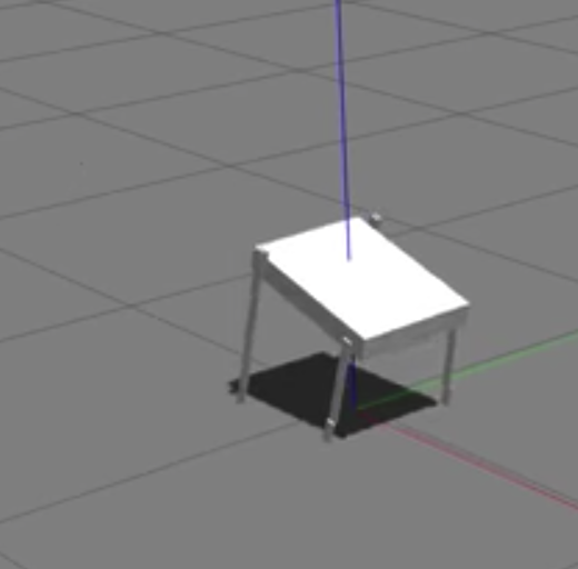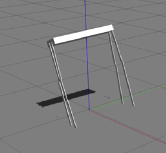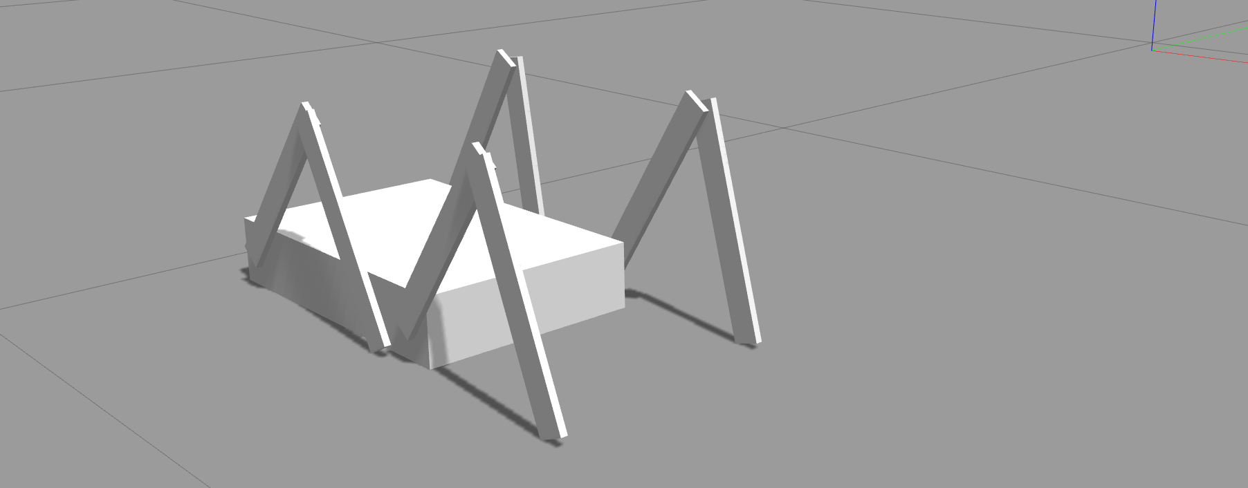 This week, the ORCAS team set finished setting up our learning environment and began running the first tests. To do this, we first needed to create a parameterized robot design that we could use in our simulations. Our initial plan was to use a two wheeled robot as the robot for which we would optimize the control and structure, be we were concerned whether the geometry of that robot would be conducive to optimization, as we felt that changes in the geometry parameters were unlikely to have a large effect on the optimal control for the design. Because of this, I built a simple four-legged robot, as seen in the images above. The robot design itself was created in the parameterized sdf format that we created, with 6 geometric parameters, and 8 controller inputs. Our algorithm is able to change the length and width of the body, as well as the lenght of the two links in each of the legs. The front legs are constrained to have the same dimensions for the right and left, as are the back legs. The controller inputs are the rotation of the 8 joints in the legs, two for each leg.