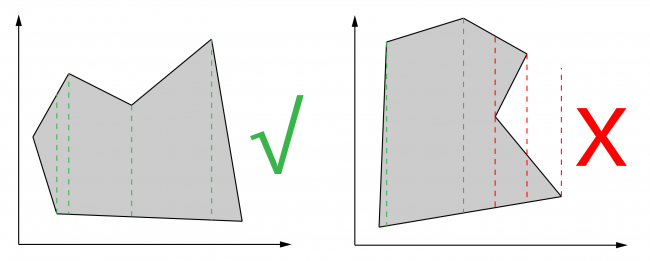 • The current implement works for convex polygons, and concave polygons with concaves vertically, but not horizontally. For a simple example: