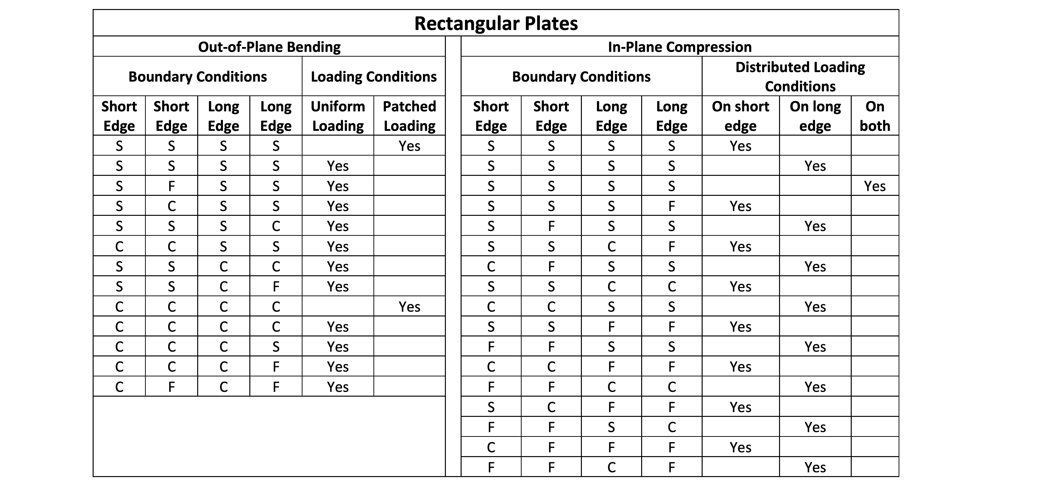 This week, I have done some research on calculating the critical buckling load and applied bending stress in a plate under the following load/boundary conditions. Those covers the most commonly seen situations. These will be used to determine the critical load in our design toolbox.