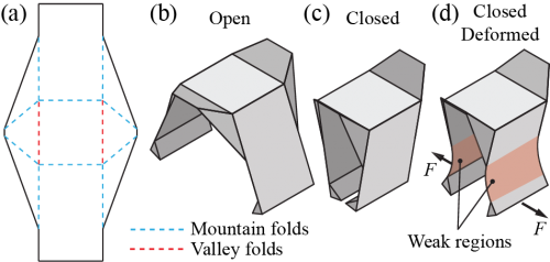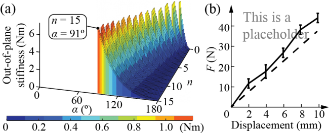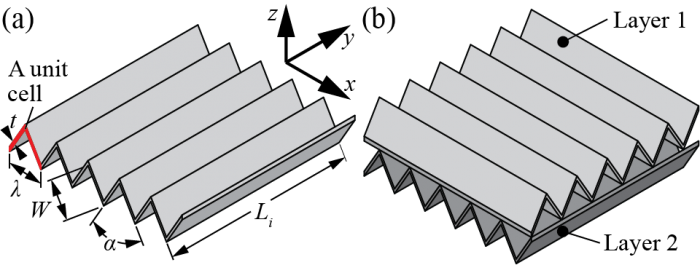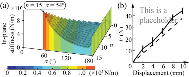 (2) Parameters: the stiffnesses (compression and bending stiffness) are both functions of n (number of creases), W (width of each unit plate), and alpha (folding angle).