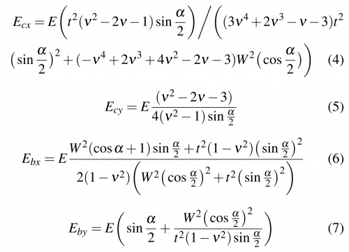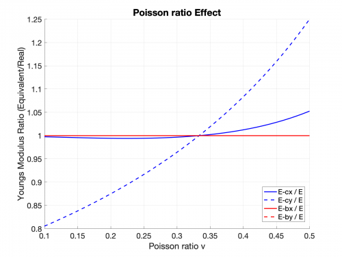 I set alpha = 180 degree and got the following equations. I plot the ratio between calculated Young's Modulus and that of the material. Results show bending Young's Modulus at alpha = 180 degree match the expection. However, compression Young's Modulus at alpha = 180 degree varys as functions of poisson's ratio. But when 0.25 < v < 0.4 (range for regular solids), compression Young's Modulus is within 10% error.