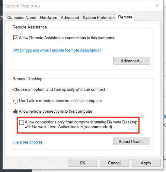 - Right click "This PC"-> Remote settings -> deactivate "network level authetication" (the red box)