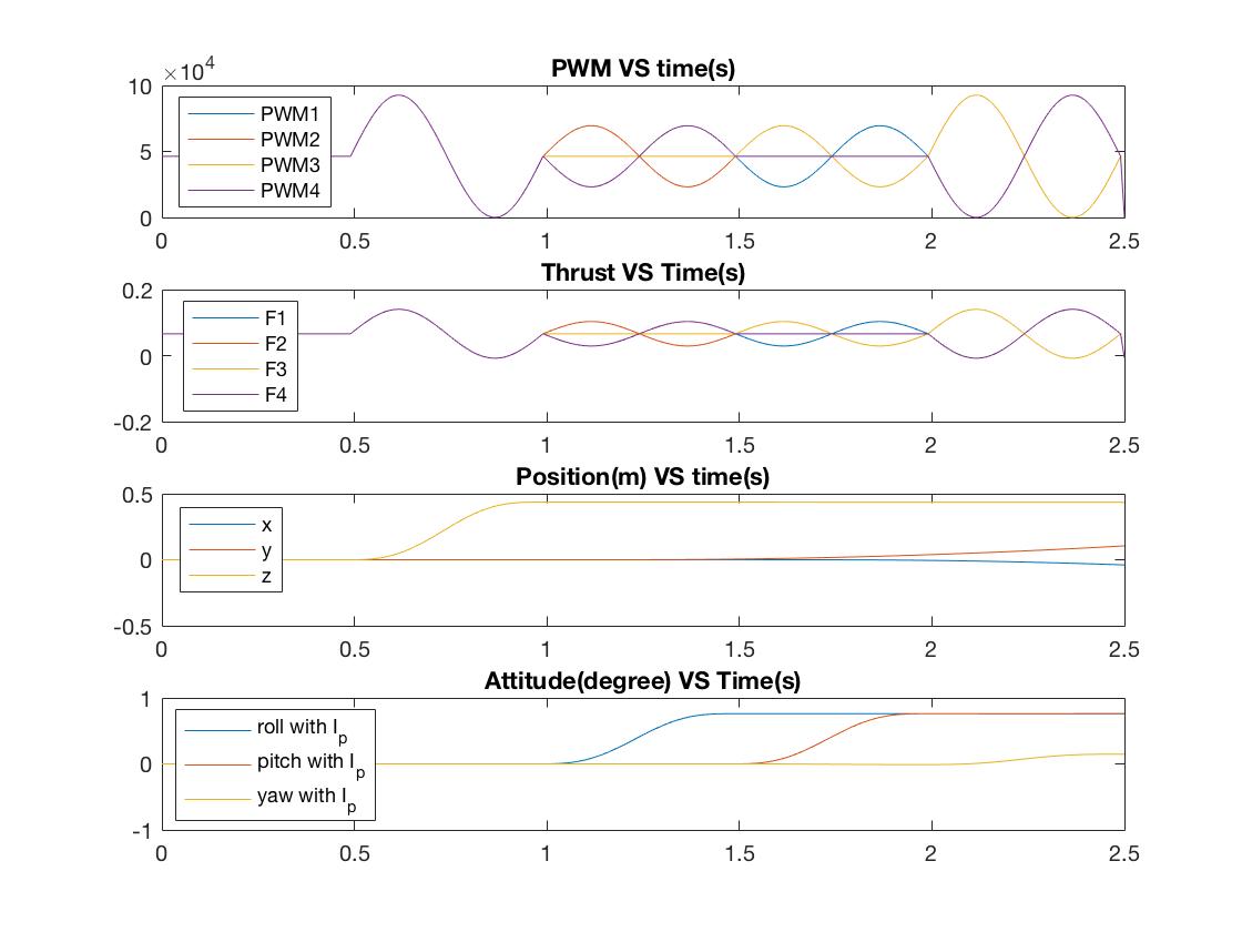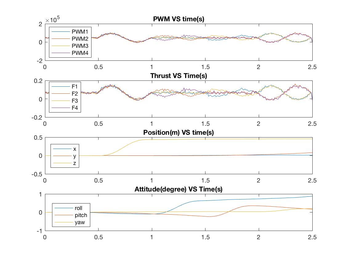 In figure 2, gussian noise were added to the PWMs. The simulation results shows the position and attitude of the system changed when noise presents.