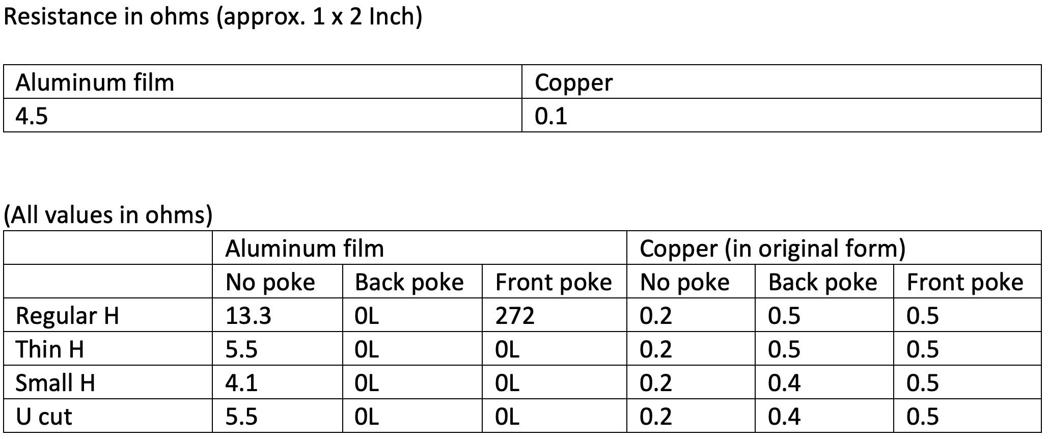 Table of results for resistance testing: