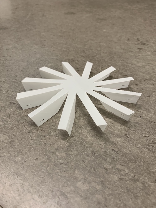 We added tabs to the RoCo design so that the tape in previous boats will be replaced by mechanical connections. We also experimented with the settings on the Silhouette paper cutter and cut out half of one paddlewheel. In the next week we will construct a boat using the Silhouette Cameo to cut out the designs and modify the parameters to create different versions of the boat.