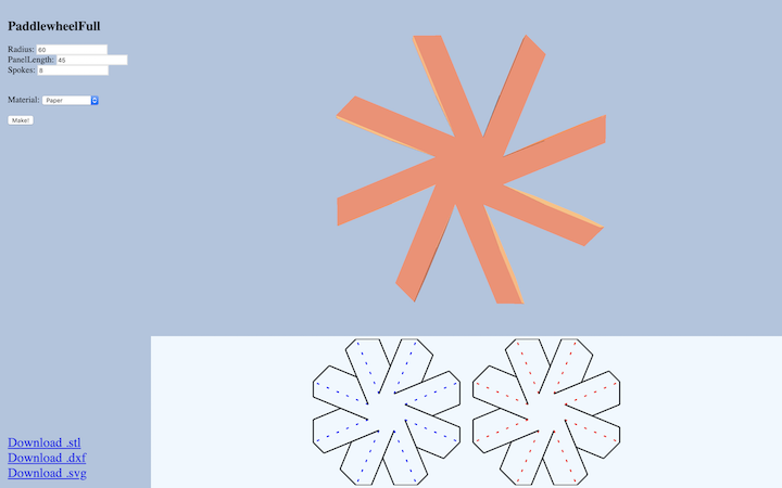 For the paddlewheels, we have implemented the correct 2D template in RoCo, but we're still working on the correct construction for the 3D model. Currently the two sides of the wheel are oriented flat face to flat face, instead of flap to flap as desired. We also need to code in tabs to connect the interfaces so that the final boat can be made completely of plastic film and electronics, and not use any tape.