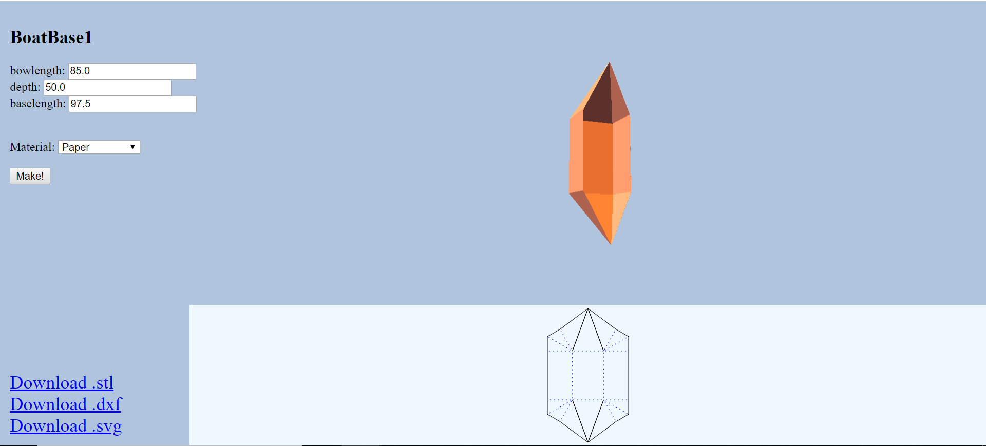 We finished making the 3D boat structure in RoCo. It isn’t perfect because we temporarily hard coded the angles between the faces, but is good enough for the demonstration tomorrow. When we complete the rest of the boat we will go back to the boat structure and figure out the angles to widen the variety of boat structures possible. We are currently having some trouble with the code that is used to assemble multiple 3D models so we will probably finish programming the rest of the components and come back to assembly later. Hopefully we are able to have the full assembly working at the end of the week so we can try making a physical boat.