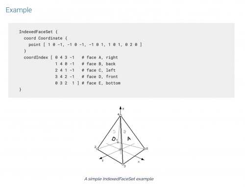 - CoordIndex needs to be specified ("IndexedFaceSet uses the indices in its coordIndex field to specify the polygonal faces by indexing into the coordinates in the Coordinate node. An index of "-1" indicates that the current face has ended and the next one begins."): some doc to look at. An example: