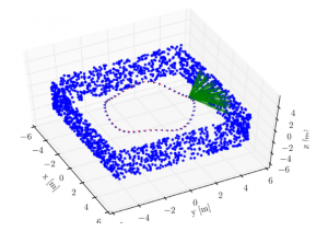 The simulation setup above has the IMU and camera moving in a circular trajectory while observing features (green lines) on the walls of the square environment. The simulation will be used to compare optimization-based NLS SLAM to the filtering-based EM SLAM and Block Online EM SLAM. Generalized coordinates are position, velocity, orientation.
