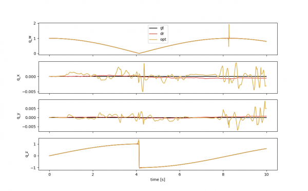 The below figures show the ground truth (gt, black), a noisy dead reckoning signal (dr, red), and an NLS optimization using the noisy dr as a seed, and IMU data to constrain relative motion.