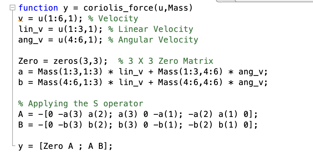 I worked on the Coriolis force module in the Simulink model. I wrote the MATLAB function that calculates the Coriolis matrix. With the completion of this module, the dynamic model is now complete. The next target is to complete the aerodynamic model. However, the equations we have come across in different research papers make numerous assumptions that are not appropriate for our use case. Therefore, there is a need to develop the specific equations to complete this section of our Simulink model.