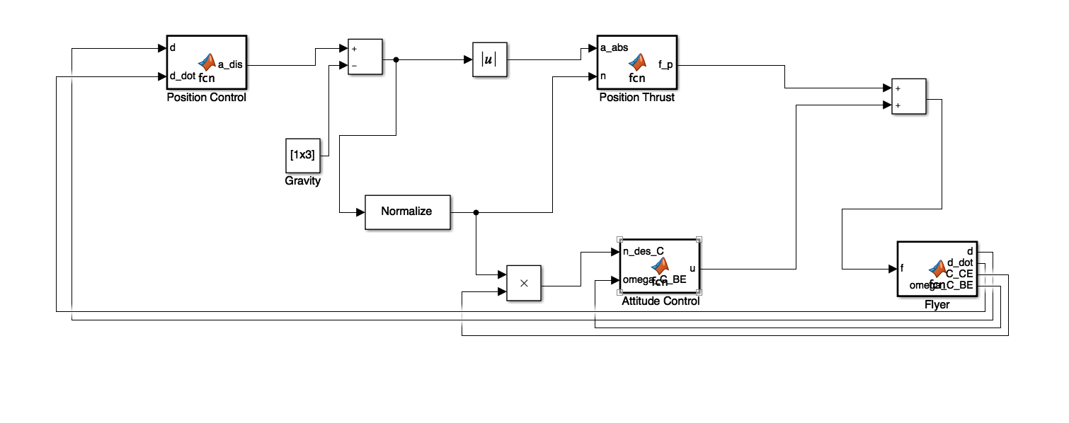 The control loop has been implemented in Simulink. The physics and attitude controller are yet to be finished.The total required thrust comes from two sources: the thrust from the position controller and the thrust required for the attitude controller. The following image shows the control loop in Simulink.