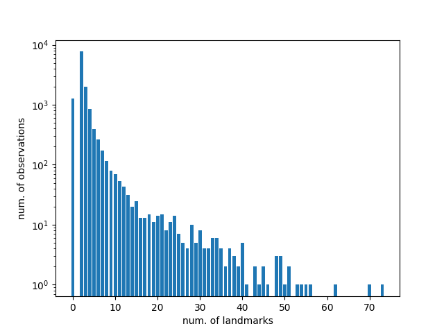 Currently, the optimization solver can not handle all the feature observations, which sum to 60,000. We may want to only consider landmarks that are observed frequently enough. This plot gives us a overview about the relationship between this threshold and the resulting observation number.