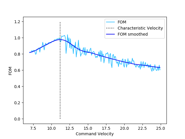 As expected, optimal performance occurs in a narrow band containig the graph of \(U = v_\text{characteristic}\). Indeed, this may be seen by looking at slices of the FOM at various fixed values for \(v_\text{characteristic}\):