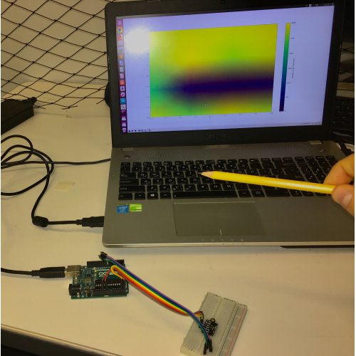 The Arduino publishes the data through the serial communication port. The data received on the computer can be translated into a 4×4 matrix using the numpy’s reshape function. Therefore, the live data values of the matrix can be plotted in a 2D contour format as shown below.