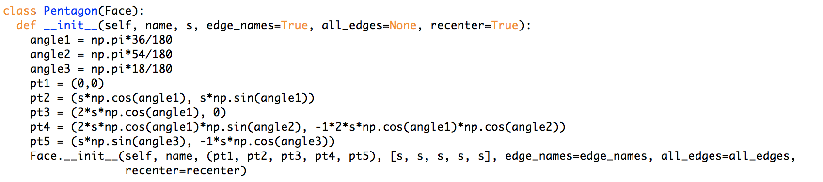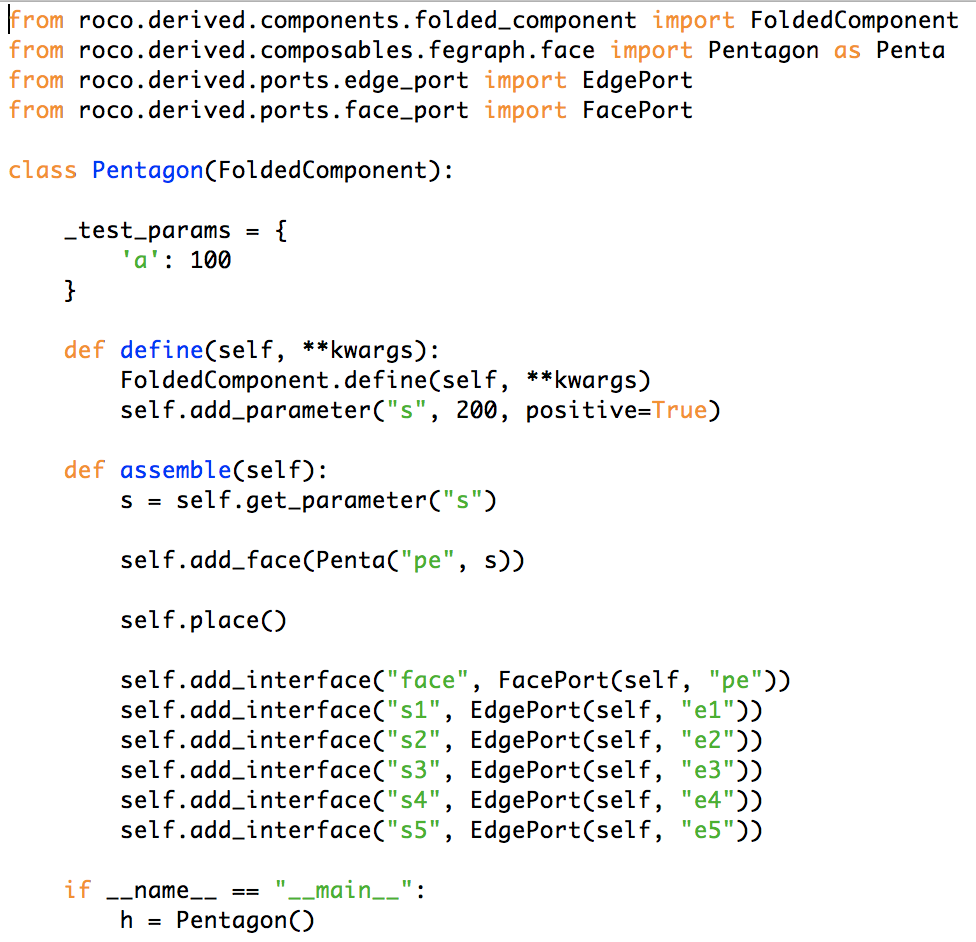 A new Component will follow the basic coding structure of defining its parameter, face, and interface (Figure 1). Each new component would also need a new face module that will define its face interface (Figure 2). I follow this coding format and created a new Pentagon component. However, when I try to use the add_subcomponent function to create a Pentagon component, I would get the following error (Figure 3).